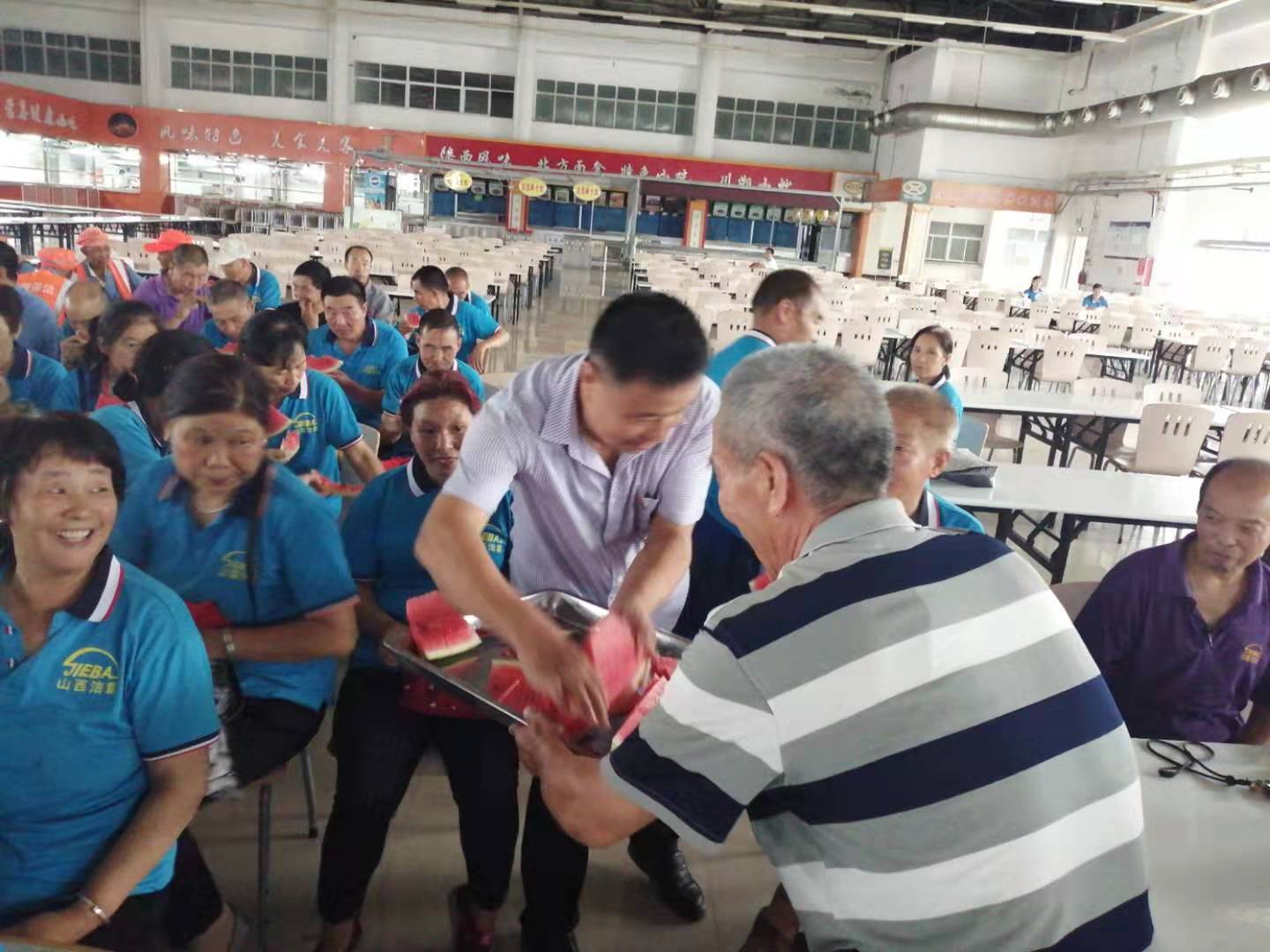 在富士康餐廳二樓,利用工作人員切西瓜的間隙,公司總經(jīng)理程晉軍作了簡(jiǎn)短的講話(huà)。他說(shuō),前一段時(shí)間,公司召開(kāi)了“安康杯”勞動(dòng)競賽動(dòng)員大會(huì ),大家要提高安全意識,始終把安全工作放在心上。他囑托大家在夏季工作中一定要注意防暑,感謝大家在酷暑下依舊兢兢業(yè)業(yè)奮斗在各自的工作崗位上。工會(huì )主席崔偉也作了簡(jiǎn)要發(fā)言,他說(shuō),今年是潔霸公司成立二十周年,希望大家在工作中繼續發(fā)揚潔霸精神,積極樹(shù)立潔霸形象,為公司爭光。