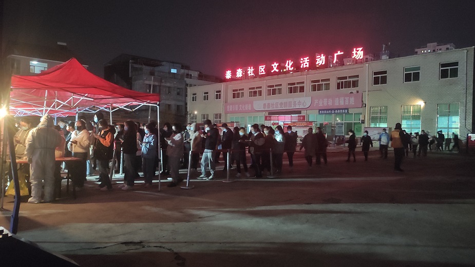 在泰森社區文化活動(dòng)廣場(chǎng),志愿者們擺桌子、拉警戒線(xiàn)、撐帳篷,齊心合力協(xié)助社區工作人員完成核酸檢測采樣點(diǎn)位設置及物資配備,同時(shí)積極引導社區居民進(jìn)行掃碼登記、測量體溫,提醒社區居民全程佩戴口罩,在排隊期間保持一米間距,組織居民做好分組,提前亮碼,核酸檢測完成后有序離場(chǎng)。雖然天氣較冷,但志愿者們毫無(wú)怨言,服務(wù)熱情很高,直至晚上12點(diǎn),協(xié)助社區完成了9000余人的核酸檢測工作。