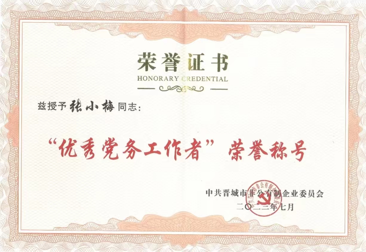 7月5日上午,市非公企業(yè)黨委慶祝建黨102周年暨“兩優(yōu)一先”表彰大會(huì )在在市市場(chǎng)監管局7樓會(huì )議室舉行。公司黨支部榮獲“先進(jìn)基層黨組織”榮譽(yù)稱(chēng)號,黨支部副書(shū)記張小梅被評選為“優(yōu)秀黨務(wù)工作者”,紀檢委員張青霞被評選為“優(yōu)秀共產(chǎn)黨員”。