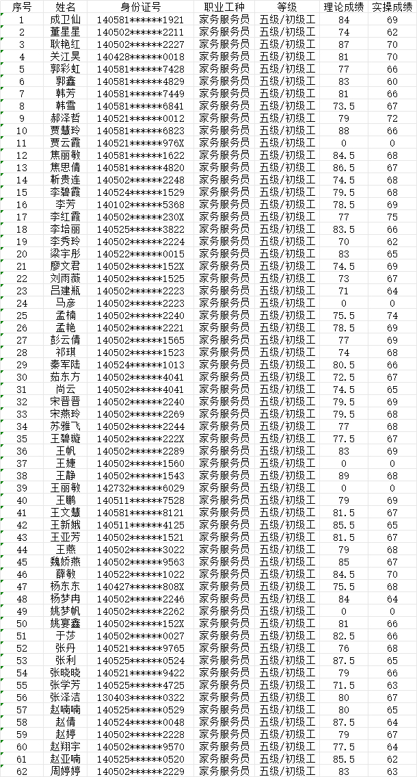 晉城市潔霸清潔服務(wù)股份有限公司職業(yè)技能等級認定中心現將2024年7月20日認定人員成績(jì)公示如下: