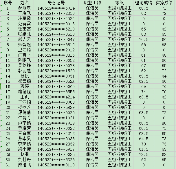 2024年8月24日第32批保潔員初級認定人員成績(jì)公示