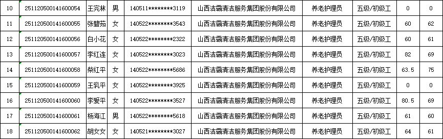山西潔霸清潔服務(wù)集團股份有限公司職業(yè)技能等級認定中心現將2025年11月23日認定人員成績(jì)公示如下: