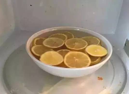 檸檬切片,放入可微波的碗中,加入4~5 湯匙醋,加滿(mǎn)水。將碗放入微波爐內, 開(kāi)高火微波5-10分鐘。將碗拿出來(lái)后, 用干凈的濕抹布就能輕松擦掉微波爐內的油漬啦!