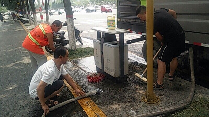 認真清洗垃圾桶周?chē)臀?/o:p>