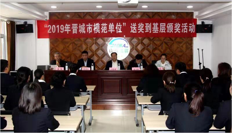 10月11日上午,晉城市總工會(huì )副調研員刁忠孝、商貿工會(huì )主席張玉濤、商貿工會(huì )干事李艷艷一行蒞臨公司舉行“2019年晉城市模范單位”送獎到基層頒獎活動(dòng),向公司榮獲“晉城市模范單位”表示祝賀,公司黨支部書(shū)記、總經(jīng)理程晉軍、公司副總經(jīng)理史志霞、公司原黨支部書(shū)記李山虎以及公司部分員工代表參加頒獎活動(dòng)。公司工會(huì )主席崔偉主持了頒獎儀式。