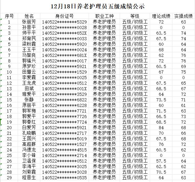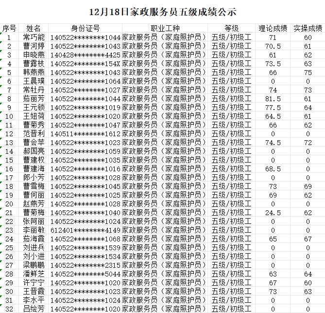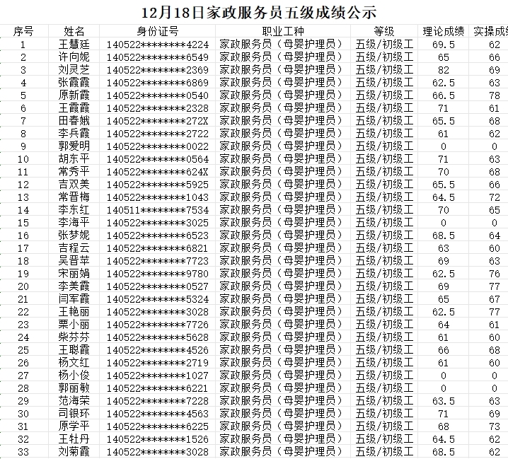 晉城市潔霸清潔服務(wù)股份有限公司職業(yè)技能等級認定中心現將2023年12月18日認定人員成績(jì)公示如下: