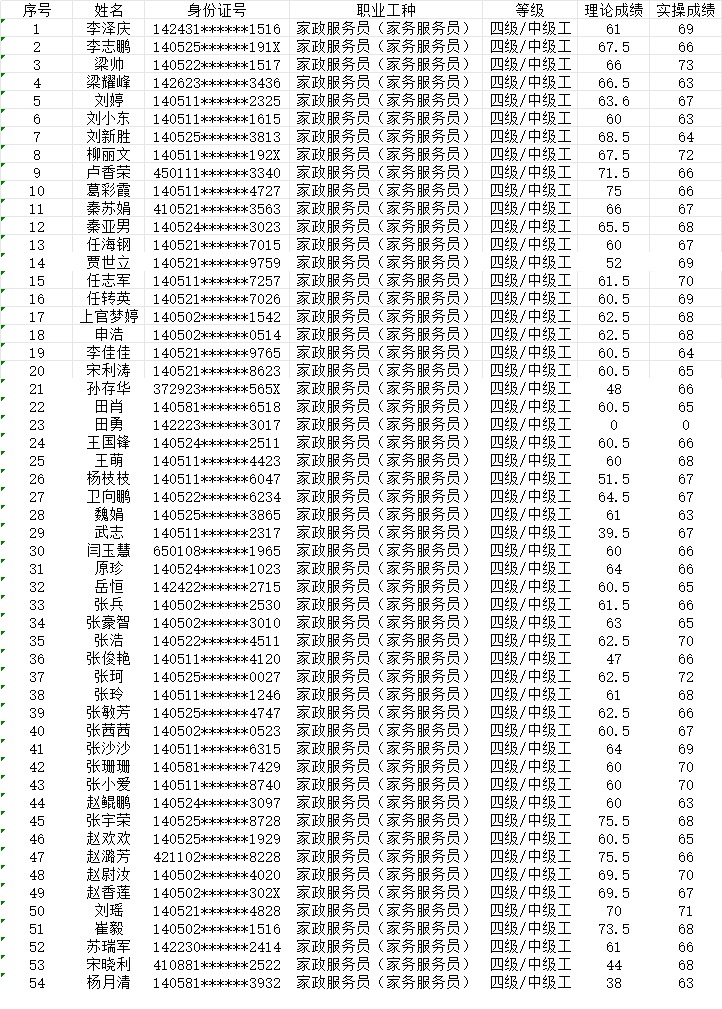 晉城市潔霸清潔服務(wù)股份有限公司職業(yè)技能等級認定中心2024年1月21日上午第3批家政服務(wù)員中級認定人員成績(jì)公示