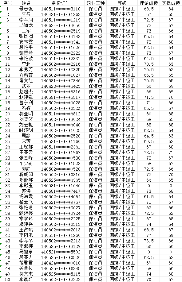 晉城市潔霸清潔服務(wù)股份有限公司職業(yè)技能等級認定中心現將2024年1月28日認定人員成績(jì)公示如下: