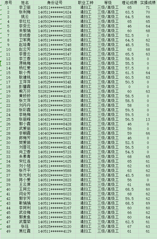 晉城市潔霸清潔服務(wù)股份有限公司職業(yè)技能等級認定中心現將2024年8月3日認定人員成績(jì)公示如下:
