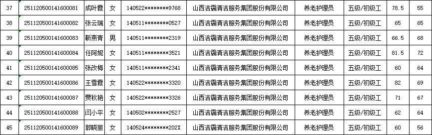 山西潔霸清潔服務(wù)集團股份有限公司職業(yè)技能等級認定中心現將2025年11月23日認定人員成績(jì)公示如下: